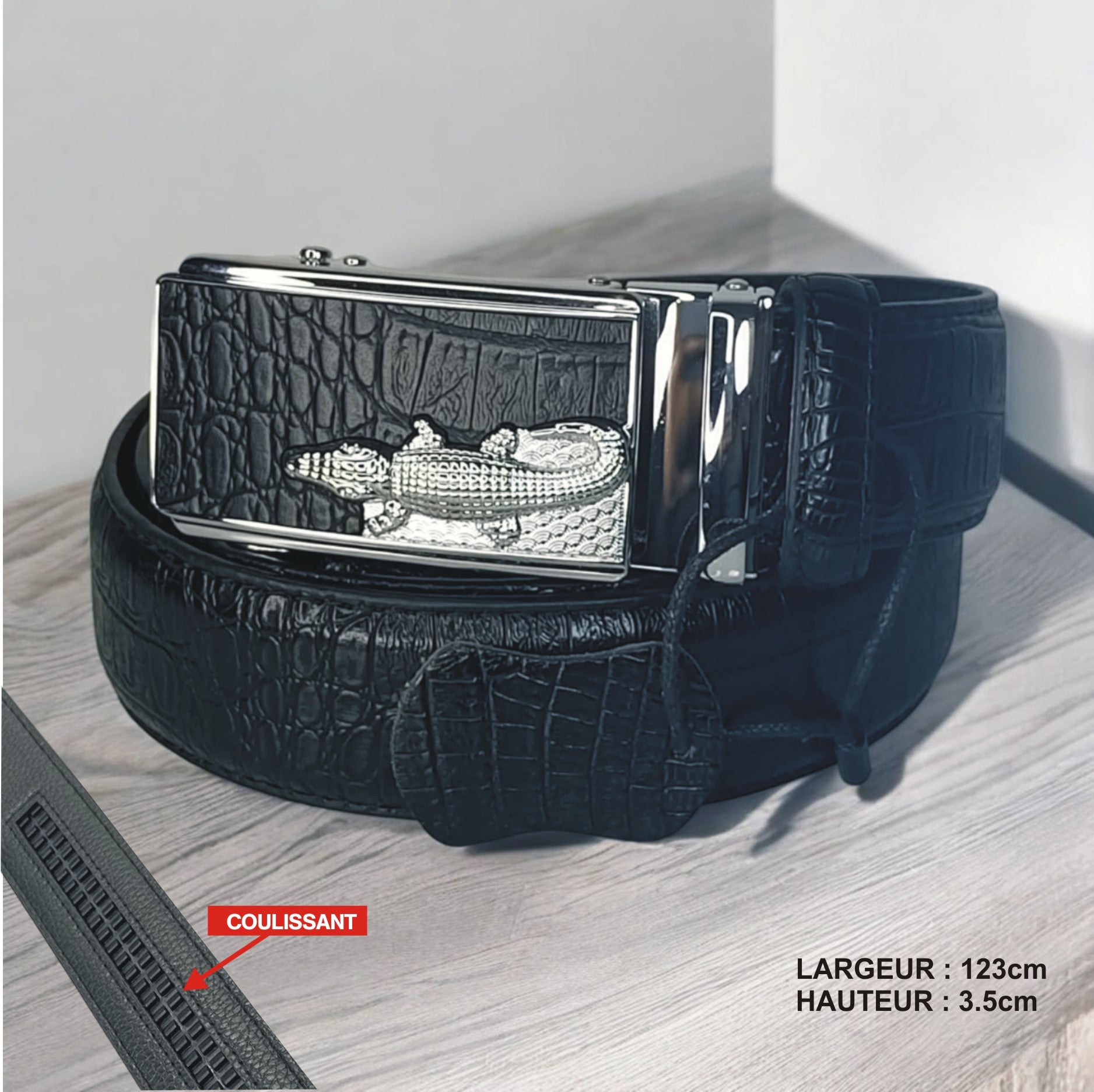 Commandez dès maintenant la Ceinture Noire Croco dans l'Eau et transformez votre look avec une pièce qui allie durabilité et élégance. Faites le choix de la qualité et de l'esthétique !